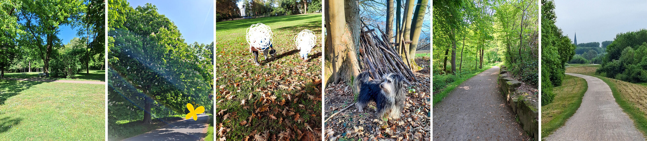 Im Heideblümchenpark sammeln wir z.B. Blätter und Äste. Auf dem Lippedamm laufen wir durch das Naturschutzgebiet Lippeauen.